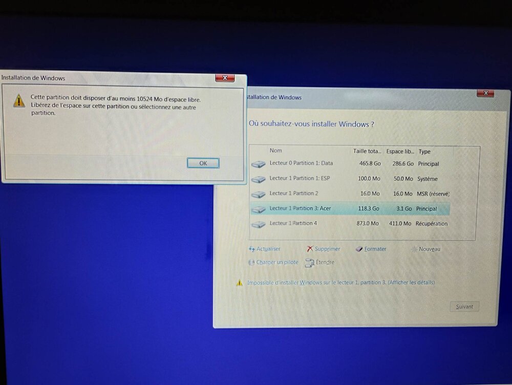 Alors il y a un problème comme tu peux le voir sur la photo que je t'envoie ... pb de place apparemment sur la partition ...