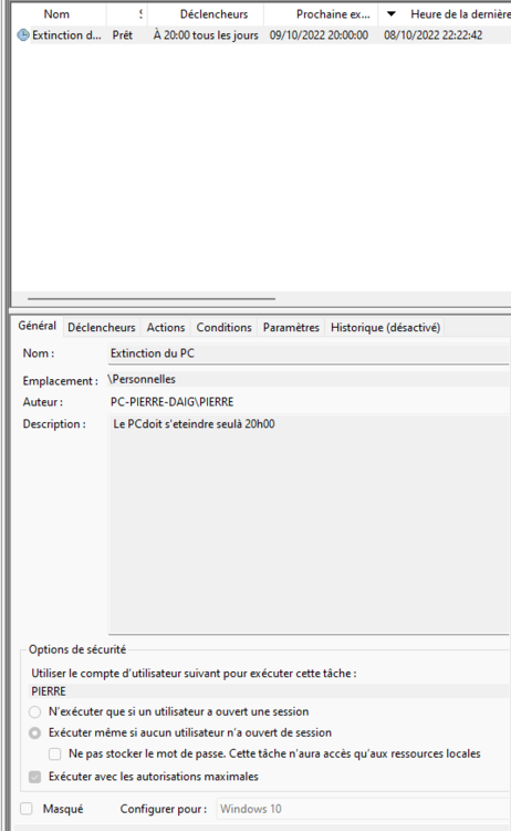 Bonjour, Je viens de faire l'achat d'un nouveau PC DELL Inpsiron AOI En remplacement du DELL Inspiron 5348 et j'ai des soucis avec le planificateur de tâches qui fonctionnait bien avec l'ancien PC. J'ai prévu une extinction du PC tous les jours à 20h00 Le planificateur de tâche s'exécute bien tous les jours, mais pas à 20h00 le résultat de la dernière exécution est toujours : (0x1) mais l'heure d'exécution est fantaisiste, la dernière à 03h13 cette nuit. et le matin, je retrouve le PC non pas arrêté mais en veille. Les paramêtres sont les mêmes que sur l'ancien PC. Qui a une idée sur le problème? Merci