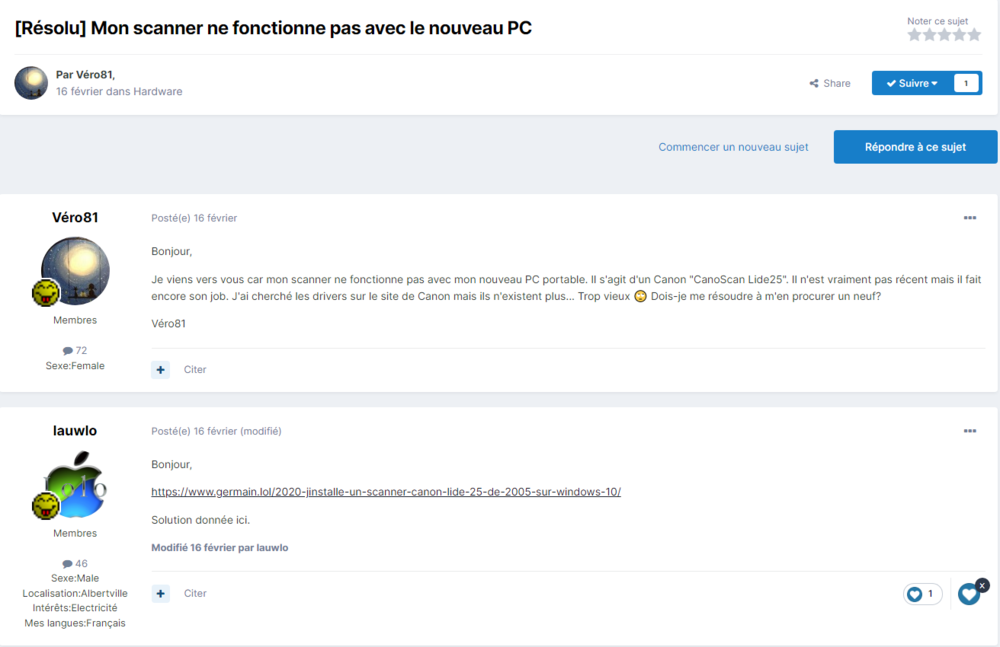 Bonjour, Je viens vers vous car mon scanner ne fonctionne pas avec mon nouveau PC portable. Il s'agit d'un Canon "CanoScan Lide25". Il n'est vraiment pas récent mais il fait encore son job. J'ai cherché les drivers sur le site de Canon mais ils n'existent plus... Trop vieux 🙄 Dois-je me résoudre à m'en procurer un neuf? Véro81