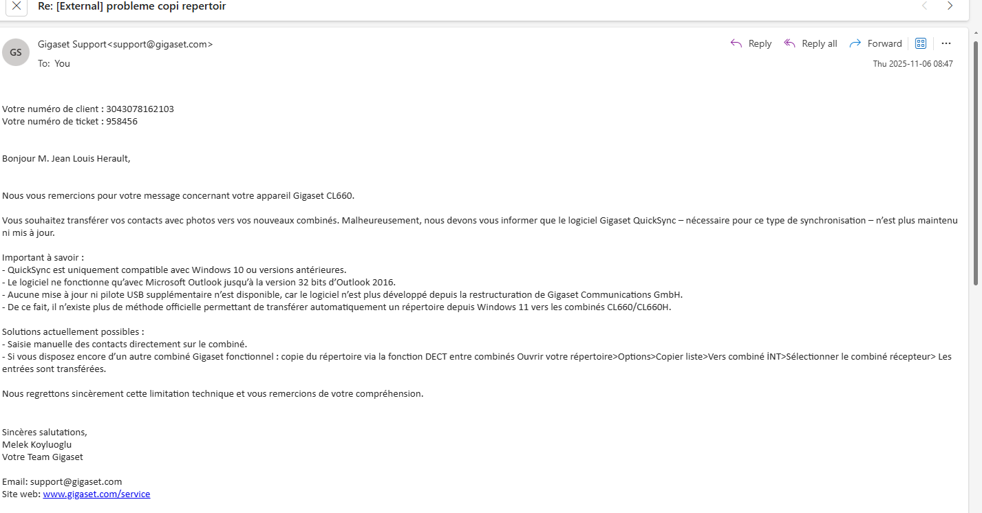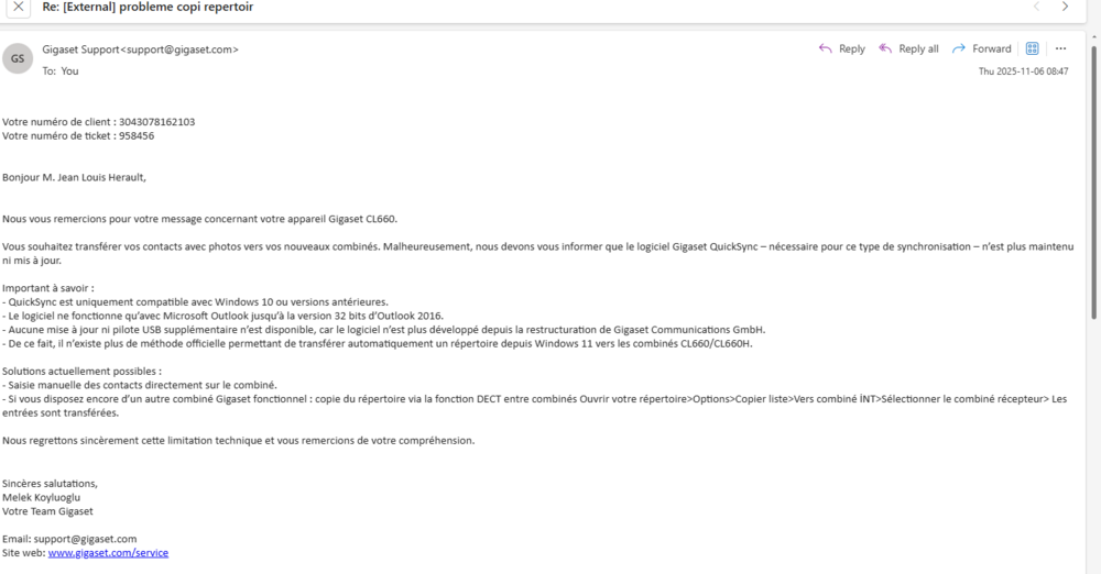 bonjour a l'achat du tel. apres avoir essaye de tranferer sans resultat ,j'avais envoye un message au sav de gigaset ,j'ai recu ce matin une reponse qui exlique pourquoi cela ne fontionne plus. -