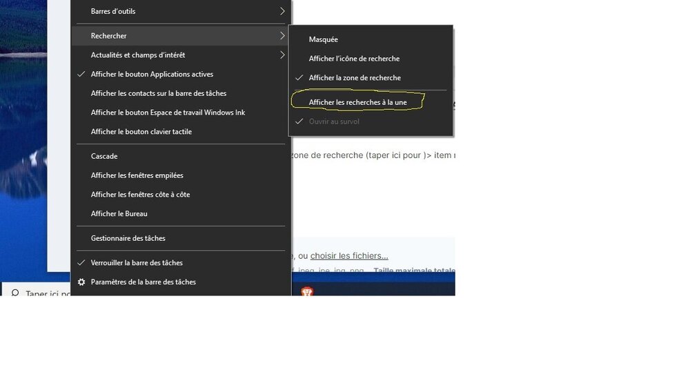 Bonjour Le Givrandais Peut être avec un clic droit dans la zone de recherche (taper ici pour )> item rechercher >décocher afficher les recherches à la une cordialement dingdong -
