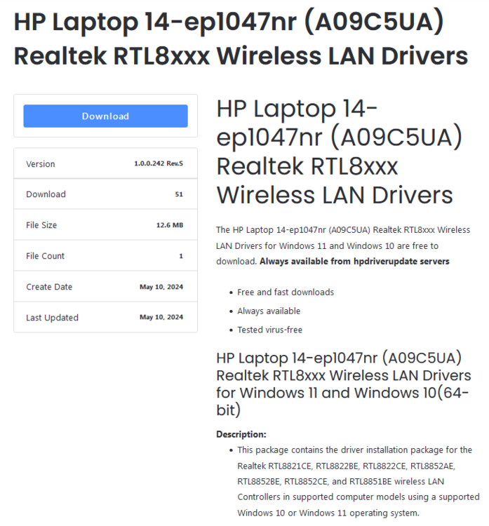 Bonjour Petite incruste... pas trouvé sur le site officiel HP Trouvé ici : https://www.hpdriverupdate.com/download/hp-laptop-14-ep1047nr-a09c5ua-realtek-rtl8xxx-wireless-lan-drivers/ sp151667.exe ---> testé AVG et MBAM --> RAS mais gaffe quand même -