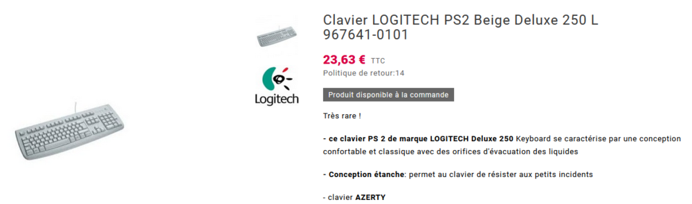 Je ne peux rien affirmer quant aux prises USB... Il leur suffit de si peu de choses pour perdre la liaison avec un périphérique Quant au clavier Logitech PS2 filaire, vous devriez pouvoir en trouver... ma capture est d'actualité mais je ne connais pas ce site de vente https://www.negocieplus.com/peripherique-de-saisie/15019-clavier-logitech-ps2-beige-deluxe-250-l-5099206992849.html On en trouve sur eBay et LBC mais avec les risques inhérents à l'occasion et à un tarif guère inférieur à celui du neuf Mais bon, c'est vous qui voyez... Ce n'est qu'une suggestion émanant d'un vieux gugus (45 ans de PC au compteur...) -