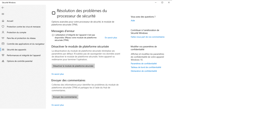 ds tpm.msc il y a bien marquer: "Le module de la plateforme sécurisé (TPM) est prêt a êtres utilisé." et version de la specification 2.0 mai dans la partie du processeur securisé ya ce Message d'erreur