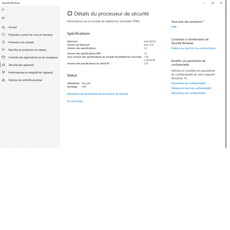 j ai isolation du noyau et j ai activé l intégrité de la mémoire mai jai tjr "pas pret" a Attestation