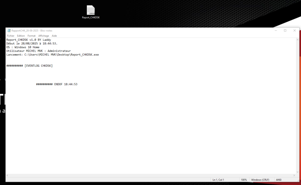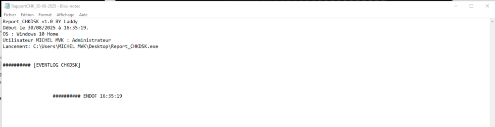 Merci pour ta patience, j ai téléchargé Report_CHDSK.exe sur mon bureau et éxécuté en tant qu'administrateur et voici la fenêtre que j'ai, est ce ok ?