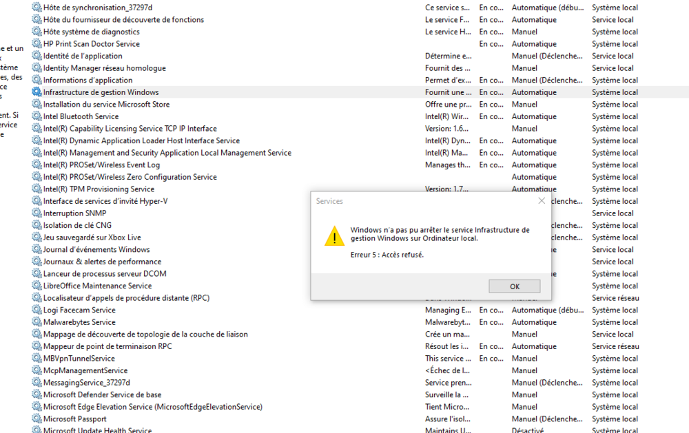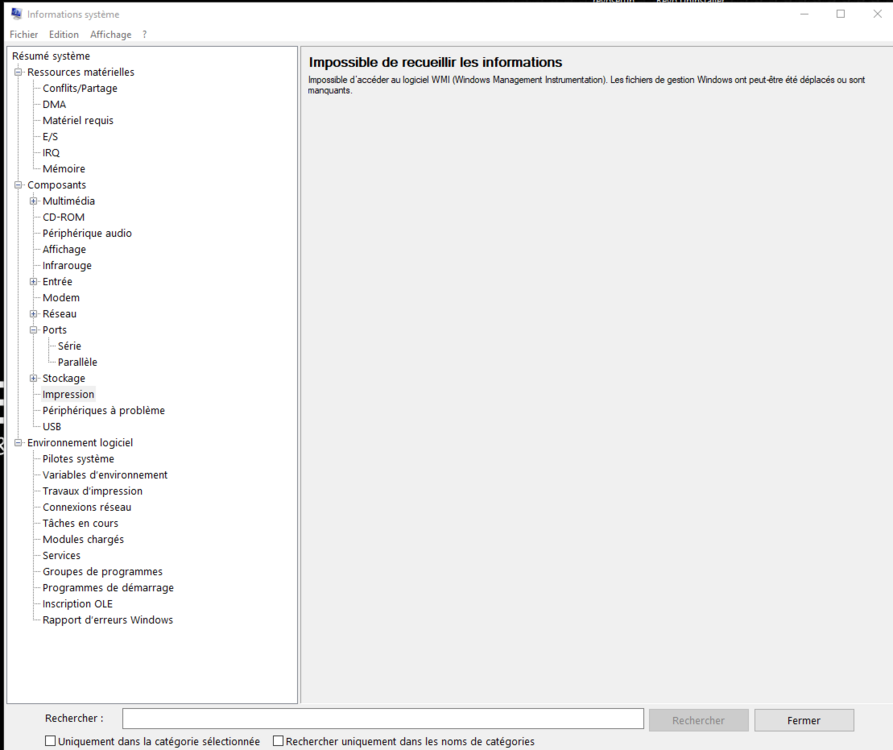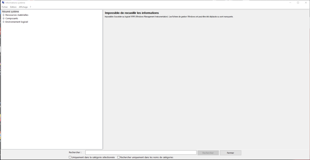 Bonjour Tonton, Je reste bloquée au point 4 pour le moment. pour répondre aux autres questions que tu m'as posées : je suis bien sur la session administrateur, le navigateur que j'utilise est chrome, quand je tape "msinfo32.exe" j'ai un message qui dit :"impossible d'accéder au logiciel WMI, les fichiers de gestion windows ont peut être été déplacés ou sont manquants", l'antivirus que j'utilise est malwarebytes. Voilà! Merci pour ton aide, mcfive