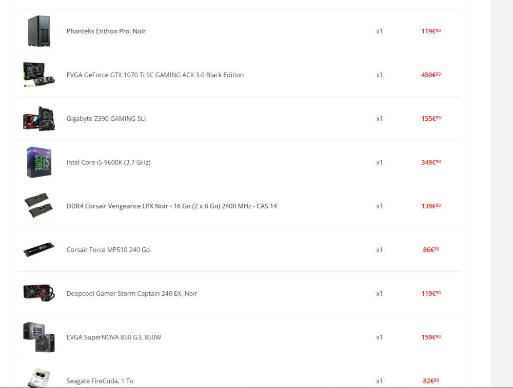 Bonjour Cher communauté de Zebulon J'ai cette config de 2019, que je souhaite upgrade ca fait un moment que je ne me suis pas tenu au courant de ce qui se fait en hardware ( utilisation Gaming , dev) Phanteks Enthoo Pro, Noir EVGA GeForce GTX 1070 Ti SC GAMING ACX Gigabyte Z390 GAMING SLI Intel Core i5-9600K (3.7 GHz DDR4 Corsair Vengeance LPX Noir - 16 Go (2 x 8 Go) 2400 MHz - CAS 14 Corsair Force MP510 240 Go Deepcool Gamer Storm Captain 240 EX, EVGA SuperNOVA 850 G3, 850W Seagate FireCuda, 1 To Ce que je pense acheter pour upgrade : Asus GeForce RTX 4060 Ti DUAL O8G EVO Kingston NV3 500 Go DDR4 G.Skill Aegis - 32 Go (2 x 16 Go) 3200 MHz - CAS 16 Qu'en pensez vous ? Merci d'avance Edit : Changement de la ram pour eviter melanger des ram de capacité et marque différente.