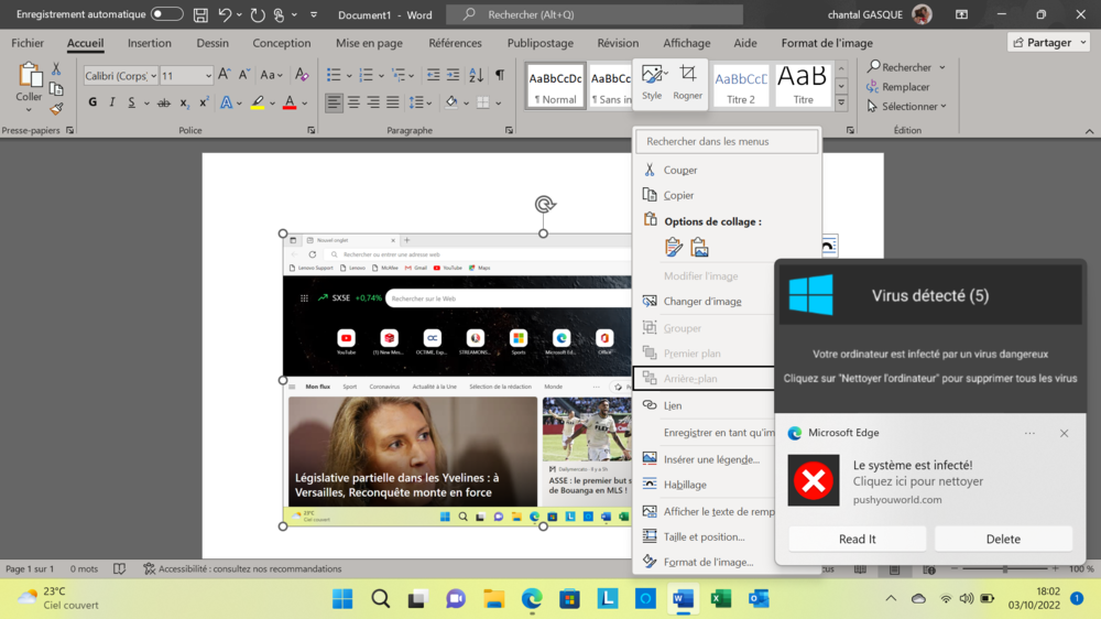 Désolé, pour le temps de réponse, pour le moment, je ne reçois plus d'avertissement par courriel. (bug sur le site Zébulon) Ok, merci pour la capture. C'est une notification du navigateur Edge d'un indésirable (pushyouworld.com) Commence par cette procédure pour supprimer les notifications Comment arrêter les notifications de sites web dans Microsoft Edge Ensuite pour vérifier. Télécharges Adwcleaner sur ton Bureau Ferme toutes les applications en cours (notamment le navigateur) Fais clique droit dessus, exécuter en tant qu'administrateur Clique sur oui pour Accepter la licence Clique sur Analyser Maintenant Lorsque le scan est terminé les éléments détectés s'affichent Choisir l'option Quarantaine Si nécessaire >> Accepte l'avertissement en cliquant sur redémarrer maintenant l'ordinateur. Ensuite Héberge le contenu du rapport C /Adwcleaner/Logs sur le site d'hébergement de fichiers Puis copie/colle le lien fourni dans votre prochaine réponse. -