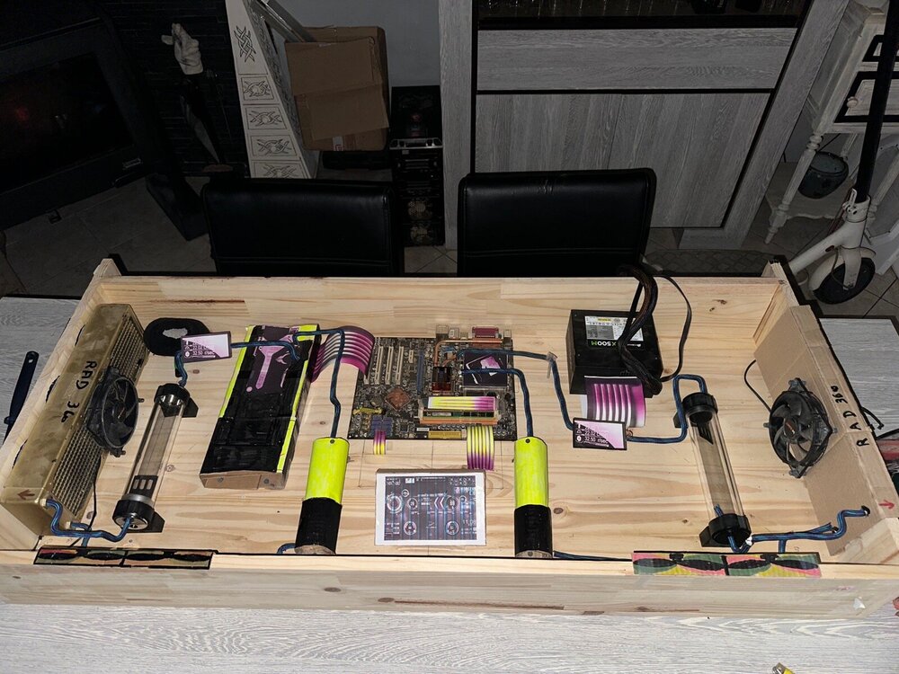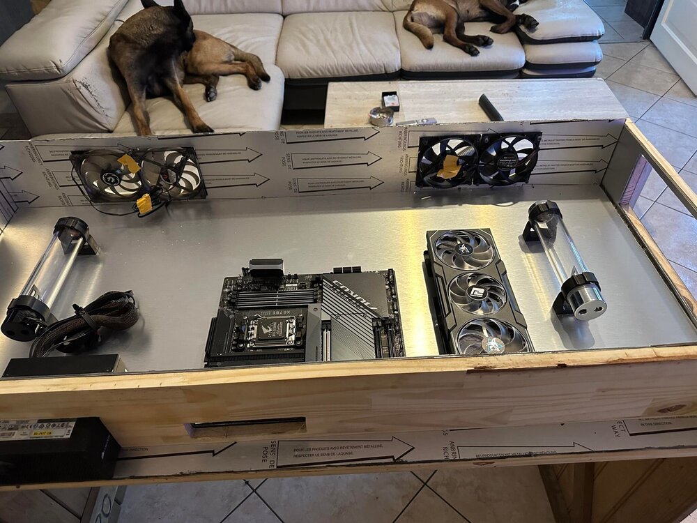 bonjour a tous je démarre la config pour mon fils et moi je veux faire un deskmod pour le matériel voici à quoi je pensais 1) carte mére GIGABYTE X670E AORUS Master GIGABYTE X670E AORUS Master (carte mère reçu) 2) Processeur AMD Ryzen 9 7900X sous eau(je ne trouve pas le waterblock argb) 3 carte graphique AMD Radeon RX 7900 XT 20go (Bykski – bloc de refroidissement à eau pour Sapphire Radeon RX A-SP7900XTX-X XTX Nitro +)je me demande si s est le bon merci 4 Ram G.Skill 32 Go DDR5-6600 Kit 5)2 pompes Bykski PC Eau Refroidissement D5 Pompe Débit Mètres Débit Maximum Lift 3.8M 1100L/H déconnexion Shoous Pompe 5V ARGB 12V RVB CP-NWD5-X-V2 + 2 réservoir cylindrique de tube modifier la couverture, G1/4 " 100mm 6) 2 Bykski-radiateur de refroidissement à eau pour ordinateur, 30x300mm 7)10 ventilateurs Lian Li UNI FAN SL120 V2 aRGB câbles)COl'hyMOON AOSOR-Bande Lumineuse LED Flexible, Rétro-Éclairage PC,24 broches,pour carte graphique 3x8P 9)Écran secondaire d'ordinateur de 5/7 pouces, écran de surveillance de la température de l'armoire PC, écran tactile Host Aida64 Live Wallpaper 10)2 Bykski PC – thermomètre de débit de refroidissement liquide, débit + débit + température 3 en 1 moniteur 11)support carte graphique (je ne sais pas le quelle) 12)alimentation ASUS PSU ROG Thor 850W Platinum II 13)raccords 6 pièces Granzon GD-FT14,6 Granzon GD-X, raccord librement rotatif à 360 degrés,4 Granzon GD-SK G1/4 "Multi-direction raccords distants 360 degrés fendu , 4 bouchons Bykski bancs de refroidissement par eau Up Lock Plug raccords, noir,2 vanne de vidange d'eau G1/4,tube BYKSKI B-YKLWP/B-PETGWP,500MM Transparent diamètre 14