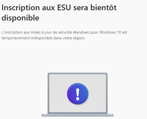 Bonjour tomtom95, Mon collègue est passé chez moi et on a finalement lancé sa solution de contournement. Celle-ci à sa grande surprise n'a pas marché ( Ok sur 4 autres PC concernés pour ESU Windows 10). Par contre, sous Windows Update, j'ai maintenant une demande d'inscription au programme ESU qui se termine par : Ne serait-ce pas, en partie, l'origine de mon problème d'inscription au programme ESU ? -