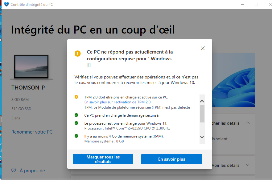 J'ai voulu forcer le passage à W11 du PC de mon fils, celui ci est impossible car module TPM n'est pas détecté par Windows. (PC TOSHIBA NX15I58TU512S)
