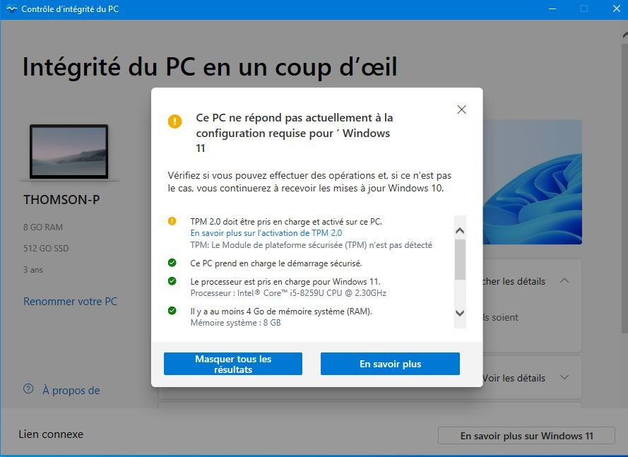 Alors plusieurs choses: - secure boot était bien en enabled - pour pouvoir aller dans les options "key management et reset to set up mode", il a fallu que je mette "custom" en option "secure boot mode". J'ai fait mon reset, et rebasculé en "standard" avant de redémarrer. - TPM device selection était sur dTPM - Intel bios guard support est sur enabled par contre une fois session ouverte je vois que dans le gestionnaire de services il n'y a pas le programme recherché, et que dans gestionnaire périphérique il n'y a pas l'option périphérique sécurité