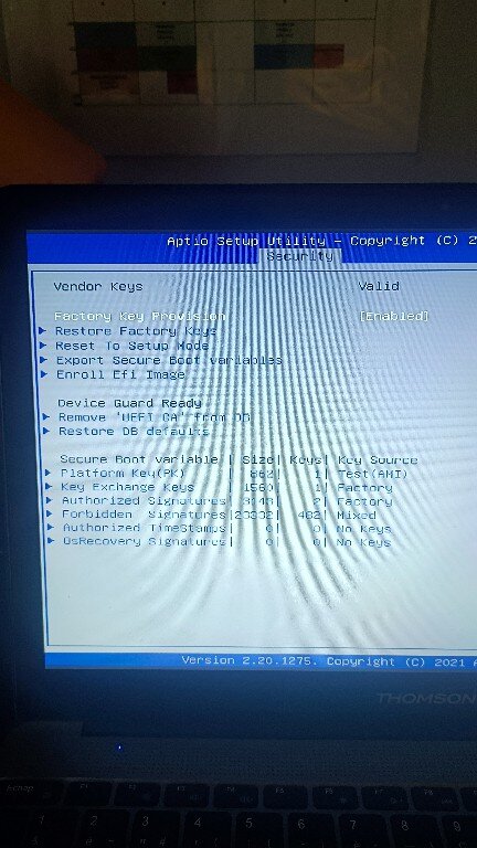Bonjour - Désolé faute de frappe, il s'agit bien d'un PC de marque THOMSON. Celui qui s'en rapproche le plus semble être le NEOX 15 Intel Core i5 - Secure boot semble activé, d'ailleurs je poste une capture écran du logiciel contrôle intégrité du PC - J'ai essayé la manip proposée sans résultat. Je poste la capture écran également