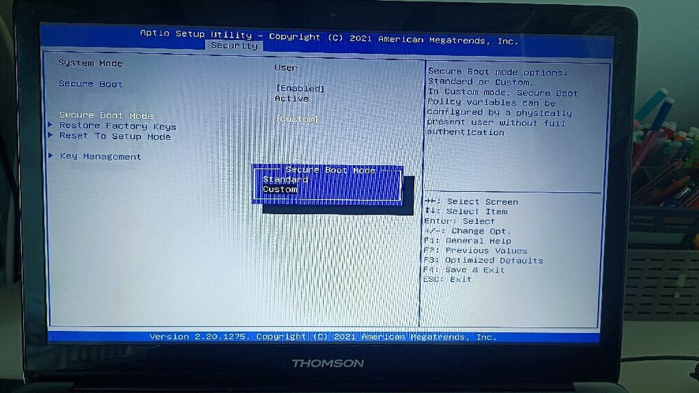 Je précise mon précédent message. Depuis la manip', je n'ai plus la possibilité de sélectionner les 3 options dont tu parles mais qui sont pourtant visibles sur l'écran. Je ne peux sélectionner que 2 lignes: "secure boot" ou "secure boot mode"