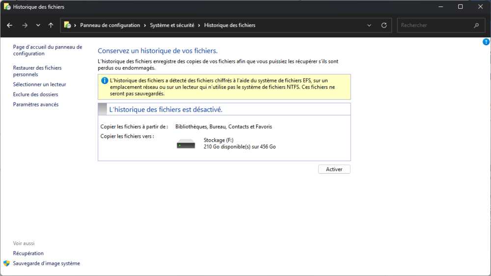 Salut Tom je lance donc une réinstallation de windows avec windows update j'ai essayé de suivre le tuto qui dès la premiere etape me renvoi dans les cordes : Comme c'est pas du tout rassurant et meme enervant, on se dit qu'on va trouver un autre moyen de sauvegarder? Alors je finis par trouver réinstallation par windows update, il me telecharge une version windows de réparation, et on verra ensuite... N'empeche que j'ai pas pu sauvegarder mes fichiers avec Historique des fichiers, j'imagine que c'est pour faire aller vers OneDrive (qui te diras de payer quand t'auras dépassé 20Go par exemple) Dans l'absolu, je me dis je m'en fout, je mourrai nu, donc je peux bien essayer... Ca s'est bein passé, j'ai rien perdu, c'est un peu a l'aveugle, on voit rien de ce que windows repare, et on a aucun raport de l'installation. C un peu bizarre... -