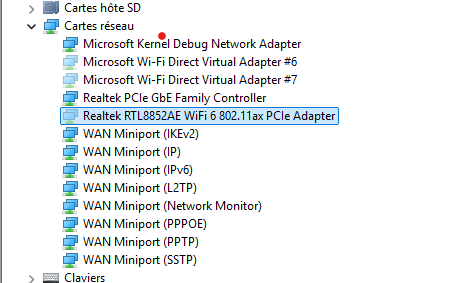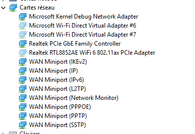 14. @tomtom95 Je sais bien que ce correctif ne concernait pas ma connexion wifi mais je tente au cas ou un miracle arrivait 😄. Oui, tous connectés sur ce même réseau wifi, plusieurs smartphone, pc perso et boulot ( avec connexion wifi maison +VPN boulot). Oui, une lumière orange s'allume si mode avion activé, ce n'est pas le cas. J'ai vérifié tous les points énoncés sur le lien "raccourci clavier" mais en version window11, tout est OK. capture de l'ensemble du gestionnaire des périphériques +celui avec ? : ok pj Capture carte réseau : ok pj, j'ai entouré les 3 périphériques apparus en plus lorsque j'ai sélectionné Afficher les périphériques cachés
