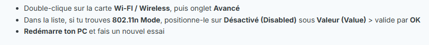 19. @Tonton Mes réponses sont soulignées Pas de changement, après la manip j'ai laissé le 802.11n en désactivé, je dois le réactiver ? Oui, la box et aussi le boitier fibre Dans la barre des taches j'ai la map monde avec un petit rond barré devant, en passant la souris dessus il est écrit "Pas d'accès internet - Connexions disponibles". J'affiche les réseaux disponibles, il y les wifi de mes voisins et le mien où il est noté "sécurisé". Oui mon réseau habituel est présent, manip du point 2 refaite : sélection de l'option "connecter automatiquement" ok cochée . Dans réseau et paramètre Wifi : Adresses matérielles aléatoires (protéger votre vie privée en rendant plus difficile ..... votre appareil) ACTIVE Bonne soirée