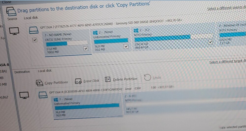 salut a tous avant de faire une bêtise , j'hésite ! je lance macrium sous dos via une clé usb (bien plus sécurisant que sous windows, c'est mon avis) toutes mes sauvegardes je le fait comme ça (images disque) jamais eu de soucis , mais la ? le clonage ? je sais pas trop quoi faire , une partition de 16Mo qui sort de je sais d'ou ? disque neuf me perturbe (formaté GPT sous Windows 10) au moment de cloner le disque je vois ça ! j'ai arreter .... je supprime cette partition ? je formate ? ou ? merci je précise bien je veux cloner le ssd de 500Go sur celui d'en bas (1To)
