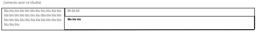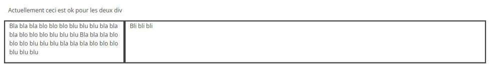 Merci Dylav, En effet sa fonctionne pour les grand écran et en même temps pour les petits cela ne vas pas. Le bloc Bla bla bla ce place entre les deux autres bloc et il devrait être tout en bas. Il existe en effet des solutions en faisant flotter un bloc, cependant je n'aime pas trop cette perspective... Je pense qu'il y à moyen d'éviter cela, je continue à chercher. Si tu as d'autre suggestion n'hésite pas et un tout grand merci pour ton aide. Bien à toi Dylav.