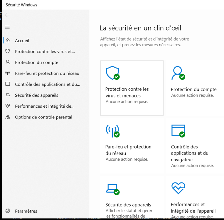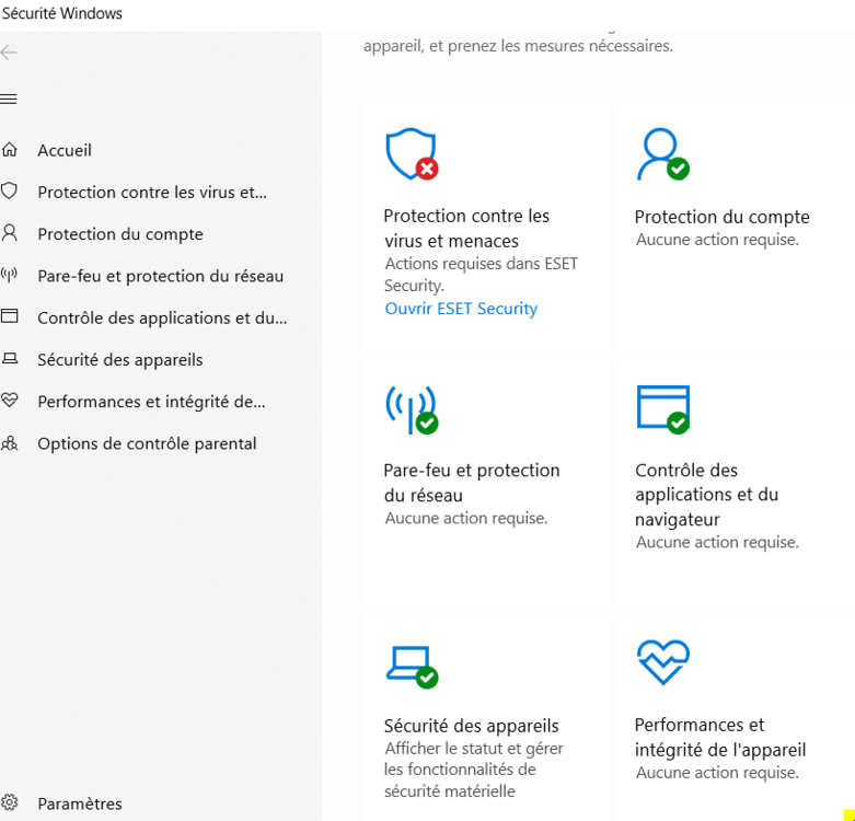 Bonjour: OK pour m; defender . 1. POUR LES W UPDATES : j'ai téléchargé ce qui était proposé MAIS il y a ERREUR RENCONTRE = ( VOIR PHOTO 19 ) ..... malgré plusieurs tentatives d'installation !? 2. J'ai donc fait un contrôle d'intégrité de ce PC ACER = ( VOIR PHOTOS 20 et 22 ) ... 3. Concernant la sécurité de mon PC ACER , je ne comprends pas que j'ai du VERT dans sécurité windows = ( VOIR PHOTOS 2 et 4 ) ..... ALORS QUE j'ai une alerte ROUGE pour mon antivirus ESET ( VOIR PHOTOS 5 et 7 ) ..... que je veux d'ailleurs désinstaller pour ne pas renouveler l'abonnement !!! ;;; JE précise que je navigue actuellement sans ETHERNET mais avec seulement un point d'accès mobile de mon téléphone . 4. Concernant le MODE SANS ECHEC : dans l'écran du mode sans echec , en bas à droite , apparait une fenêtre ( VOIR PHOTO MSE 1 ) qui invite à aller dans PARAMETRES : DONC je vais sur parametres puis reseau internet ( VOIR PHOTO ) puis j 'arrive sur ETAT STATUT DU RESEAU ( VOIR PHOTO MSE 2 ) = et c'est là que je ne sais pas ce qu'il faut faire pour créer une connection internet avec mon point d'accès mobile ! C'est là que j'ai besoin de votre aide Par avance merci . JPC38 On verra plus tard pour désiinstaller ESET NOD32 ............... ..... -