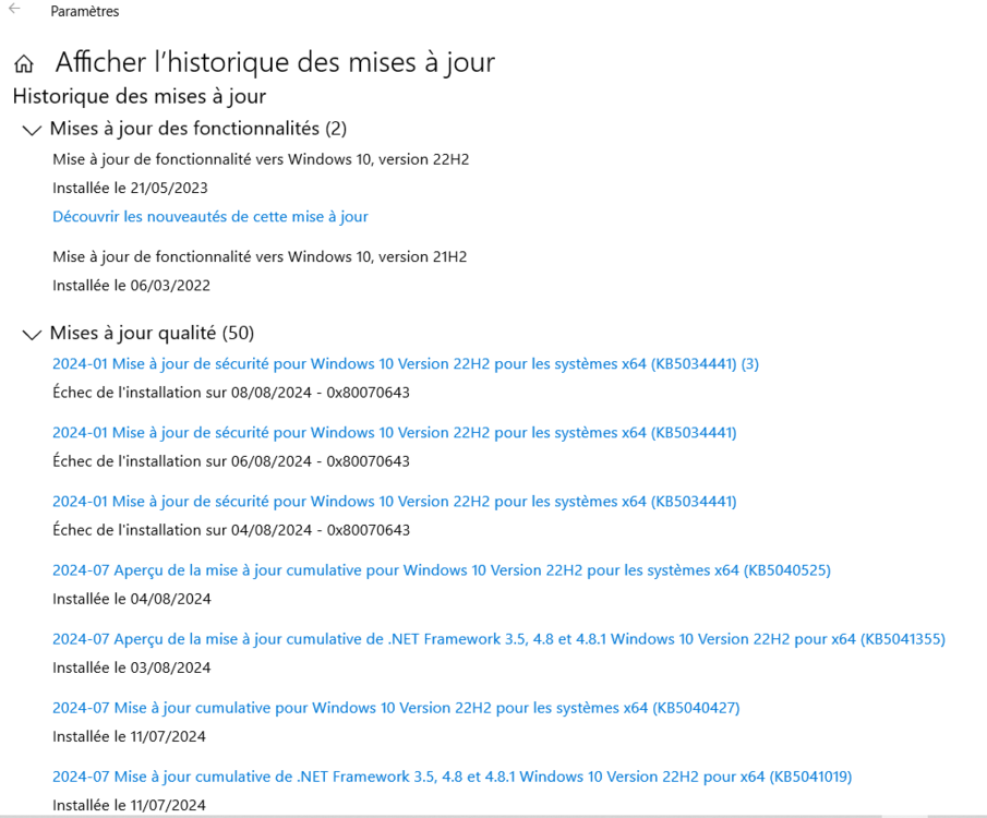 Bonjour , OK : et merci à Tomtom95 pour suppression de l'AV ESET ! Pout Tonton: 1. POUR WUPDATES: il y a encore une erreur : VOIR PHOTO 1 2. POUR mises à jour facultatives : faut-il vraiment une MAJ ? VOIR PHOTO 2 ? 3. J AI fait un historique des MAJ : VOIR PHOTO 3. 4 j 'ai fait un intégrité du PC : VOIR PHOTOS 4 ET 5. Donc quelle suite y donner ? A+. -