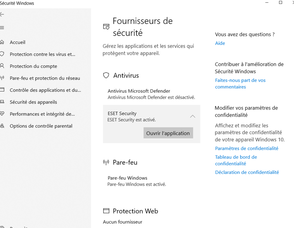 Bonsoir : j ai lu le tuto de malekal qui conclut ainsi : VOIR PHOTO 1. Donc, j'ai rebranché un ethernet ET là ça marche : l 'internet est actif ! VOIR PHOTO 2. Du coup, j'en ai profité pour désinstaller ESETNOD32 avec cette manip simple : https://support.eset.com/fr/kb5547-desinstaller-eset-smart-security-ou-eset-nod32-antivirus-dans-windows-10 ET j'ai réactivé WINDOWS DEFENDER : VOIR PHOTO 3. AUSSI, je vais en resté là . ..... MAIS, je voudrai bien mettre en oeuvre la proposition de TonTon : ""on passera l'outil FRST dans le but de désinstaller totalement et proprement ESET NOD32 par un Helper Sécu"" Voici d'ailleurs un DIAG de ZHP . https://www.transfernow.net/dl/20240806nOkKxkVK https://www.transfernow.net/dl/20240806Dbnm0f4U Merci pour faire suite . JPC38. . -