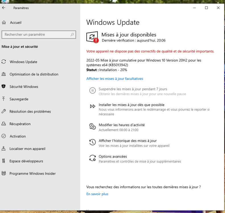 Bonsoir sur le pc de on petit fils il est impossible de faire fonctionner windows update alors qu'il me dit : "votre appareil ne dispose pas des correctifs de qualité et de sécurité importants" copie d'écran en pièce jointe specs du pc capture écran jointe. merci de me venir en aide cordialement