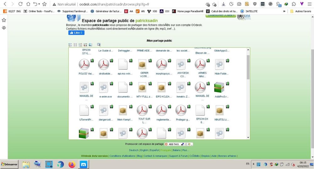 Bonjour Dylav,je suis au regret après plusieurs essais infructueux de vous faire savoir que OODESK;COM est toujours en ligne mais que c est un fait sur et certain impossible preuve ci jointe et voici ce que j obtiens quant je clique sur un fichier ou un dossier.Je suis affirmatif.Bonne journée VOUS POUVEZ VÉRIFIER VOUS MÊME SUR MON ESPACE PUBLIC http://www.oodesk.com/share/patricksadin/browse.php?lg=fr