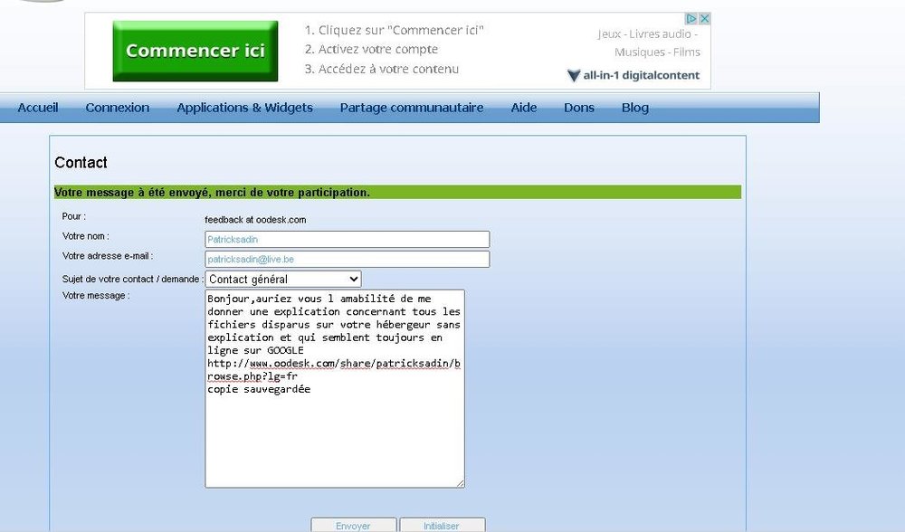 Bonjour,beau travail mais que sont devenu tous les fichiers publics & PRIVES Qui ne sont plus disponibles ET IRRÉCUPÉRABLES ,sans avertissement ni annonce publique,essayez de telecharger http://www.oodesk.com/share/patricksadin/browse.php?lg=fr