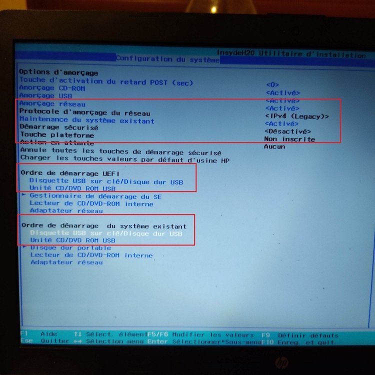 Bonjour à tous et merci pour votre aide, Désolé pour le temps que cela prend mais je travaille en déplacement. Je viens de refaire beaucoup de choses suivant vos instructions. J'ai avancé sur le bios. J'ai aussi fait ce que dis AB-Web. Je peux prendre en main le legacy et non plus le UEFI. Il a fallu que je mette en anglais pour trouver le moyen de mettre en legacy. J'ai donc bouger l'ordre de démarrage mais rien n'y fait. Au démarrage de ma clé USB, j'ai soit un écran flou ou il reste bloqué sur le sigle "HP". Je vous joins les photos du bios maintenant. Et surtout merci de votre aide. -