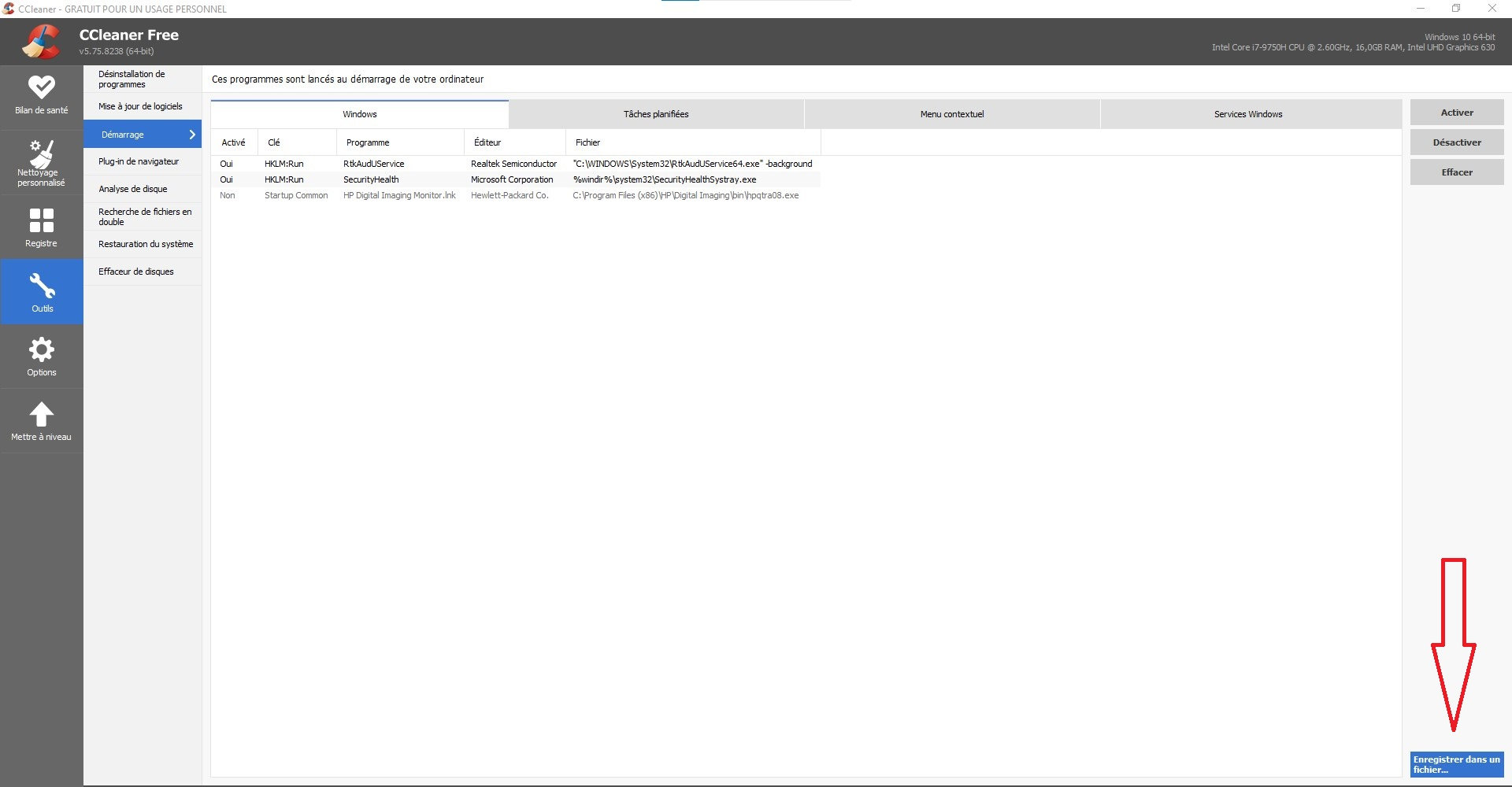 1. Logiciels à désactiver du lancement automatique en les plaçant sur "NON" dans CCleaner (colonne "Activé")