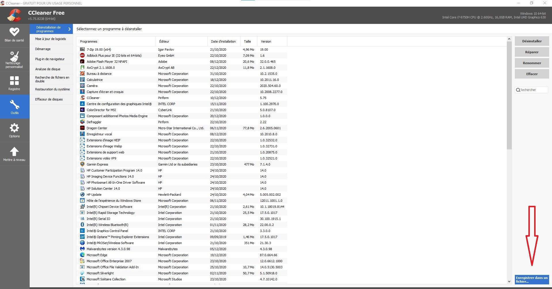 • va dans Outils > Désinstallations de programmes > Enregistrer dans un fichier (en bas à droite) :