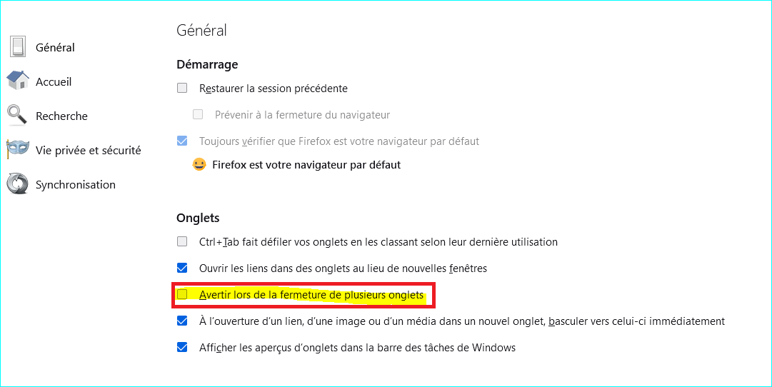 Finalement j'ai testé et la proposition est réapparue ! Il doit y avoir un autre problème sur ton Firefox, @Dylavcar si tu ne vois pas la proposition dans les paramètres, c'est que l'option est toujours activée, et c'est anormal que tu n'aies plus la demande de confirmation. Un problème avec une extension, peut-être (bloqueur de pub et de pop-up) ?