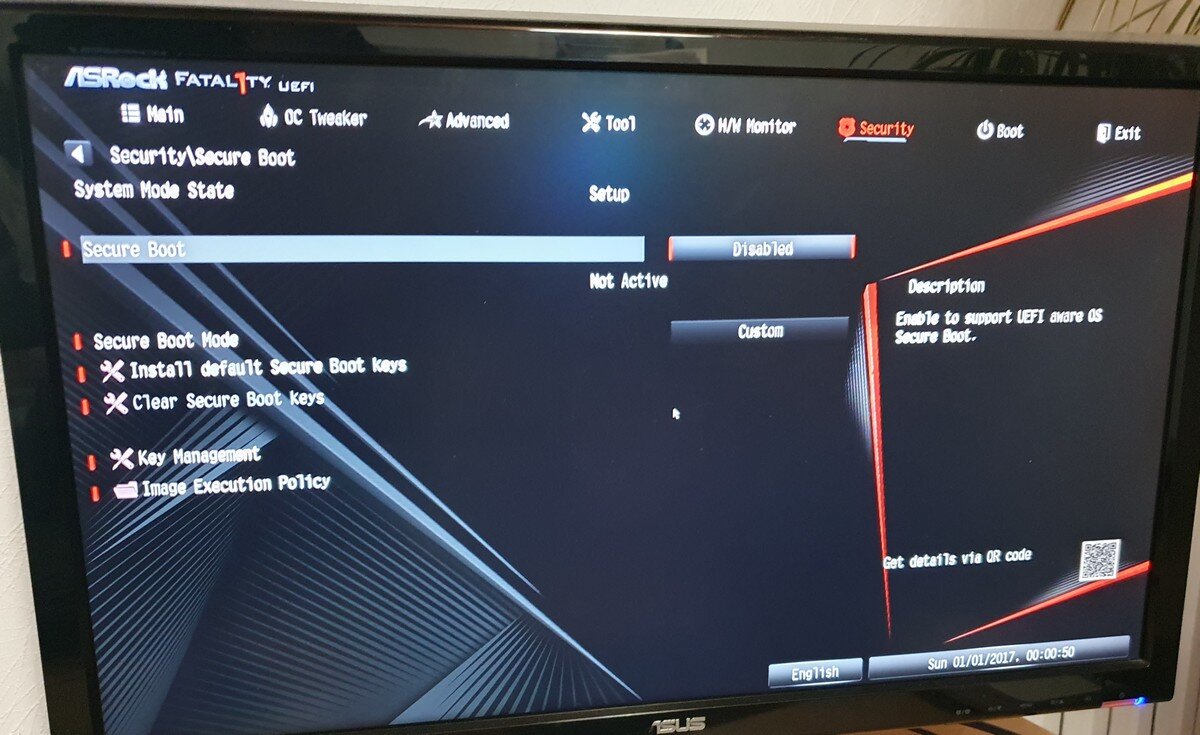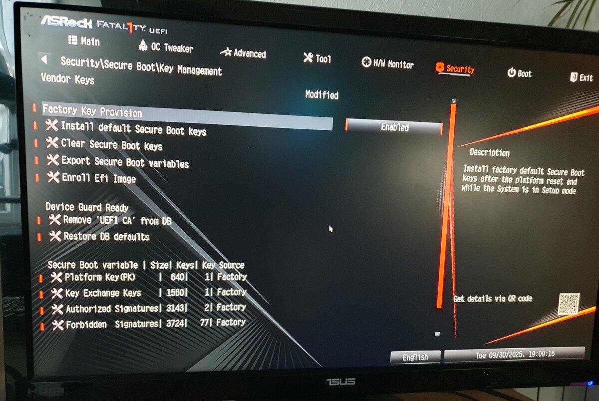 Ensuite reconfigurer les paramètres pour activer le démarrage sécurisé.
