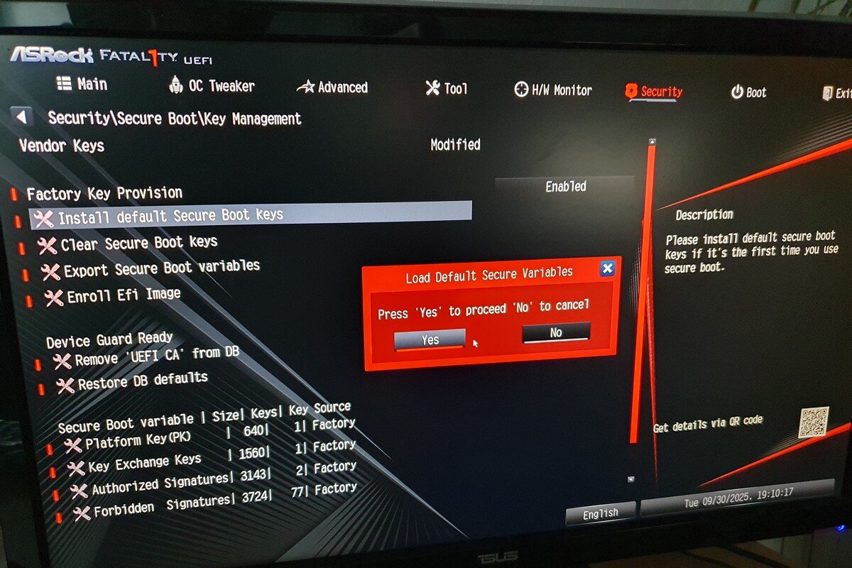 Ensuite sélectionner install defaut secure boot keys (installer les clés de démarrage sécurisé par défaut)